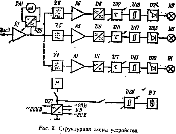 Сигнал с усилителя НЧ (линейного выхода любого канала) поступает на компрессионный усилитель А7 с индикатором перегрузки U25. Затем сигнал распределяется на шесть каналов блока управления. Через RC-фильтры Z1 — Z6 сигнал проходит на усилители каналов А1 — А6 и попадает на распределительные трансформаторы U1 — 116, необходимые для устранения гальванической связи основного устройства с питающей сетью. После интегрирующих цепочек U7—U12 и RC-ячеек U13—U18 сигнал поступает на регуляторы мощности U19 — U24 и далее на нагрузку — лампы накаливания HI — Н6. Лампой-вспышкой Н7 управляет блок U26, питание вся установка получает от блока U27, от него же питается и двигатель М, вращающий трафареты.